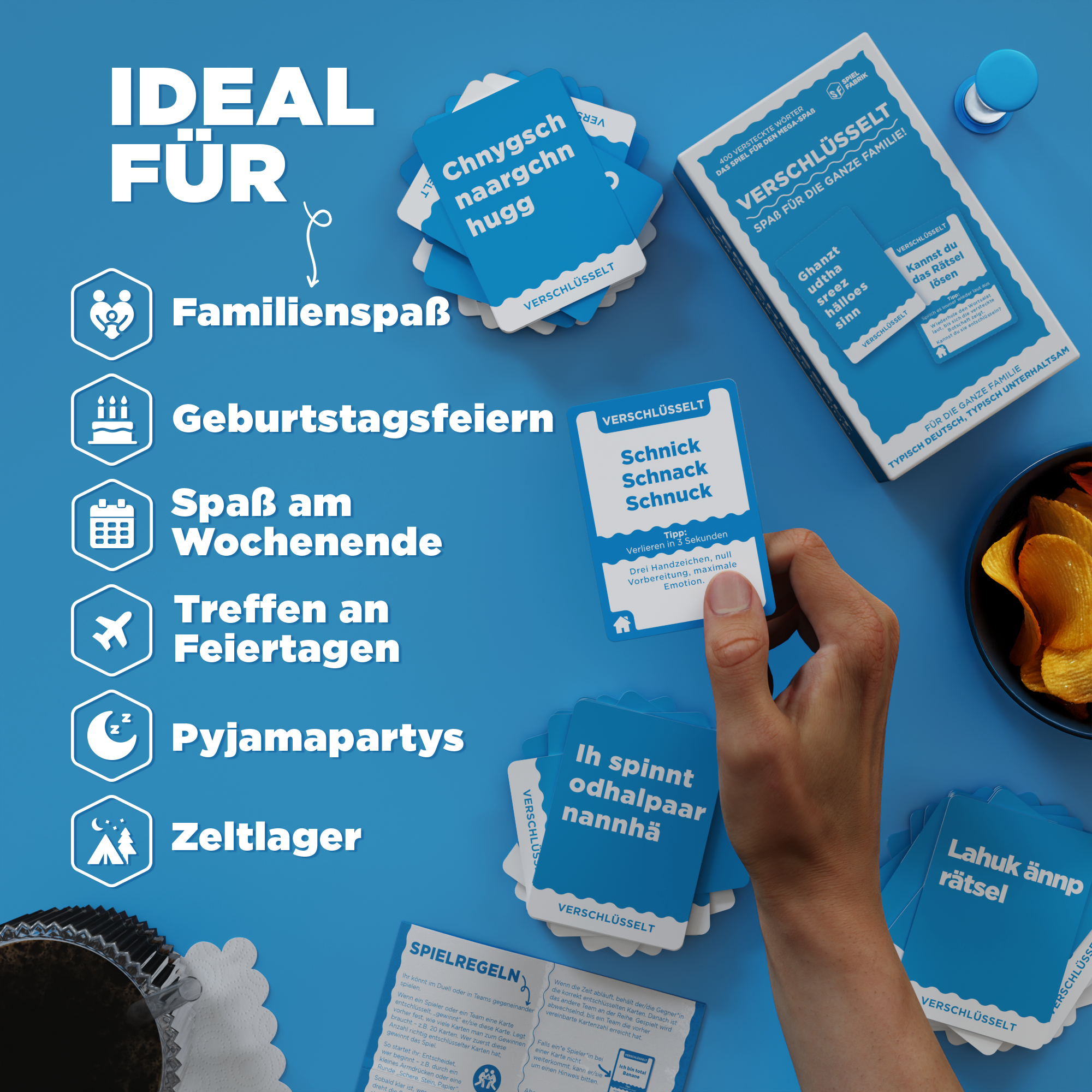 Verschlüsselt: Familienedition ist die brandneue Erweiterung zum beliebten Partyspiel Verschlüsselt. Sie enthält 400 völlig neue Karten voller versteckter Botschaften, die darauf warten entschlüsselt zu werden.